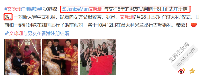 9月8日,港媒报道文咏珊与交往5年的男友吴启楠于今日正式注册结婚,曝光的照片中金银首饰堆积如山,据悉这对新人在7月28日举办了“过大礼”仪式,日前和一班好姐妹在韩国举行了婚前派对,并将于下个月12日在意大利米兰举行古堡婚礼。 文咏珊身穿华丽的中式礼服,贴身的秀禾服勾勒出她曼妙的身姿,盈盈细腰很是吸睛,她的老公也身着喜庆的红色唐装,精神十足。一对新人跪地向女方父母敬茶,满屏幸福喜悦。 新人和女方父母合影,文咏珊和妈妈手捧一对金手镯,金光灿灿。 日前文咏珊和闺蜜们在韩国举办了婚前派对,身穿红色婚纱的她被闺蜜们“捧在怀里”,犹如集万千宠爱的小公主,姐妹们感情真好。 除了室外身穿婚纱和伴娘裙的集体狂欢之外,姐妹们和文咏珊还换了多套造型拍照,当然每张照片的重点都是准新娘文咏珊。 其中一张照片中文咏珊和闺蜜们都换上了纯白色的look,只见准新娘坐在C位照着镜子,而闺蜜们都拿着工具在一旁随时准备帮她“做造型”,场面十分温馨有爱,尽显姐妹情深啊! 大家戴着姐妹手镯,用手围成一个圈,其中文咏珊手上戴着的钻戒十分抢镜,真是默默地秀了幸福呢! 文咏珊的婚前派对,蛋糕、鲜花、气球,布置温馨浪漫,而且她只请了最好的闺蜜们,闺蜜伴娘团个个精致漂亮,氛围很暖心,不少网友都表示这排场都胜过昔日好闺蜜baby了,你们觉得呢? 文咏珊和吴启楠这一对新人,俊男搭美女的组合,分外亮眼,30岁的文咏珊找到了托付终生的另一半,恭喜!