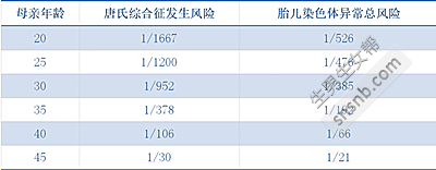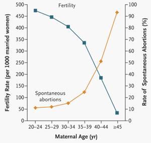 ![]() (图:生育力、流产风险与女性年龄的关系) 高龄女性的卵子非整倍体率发生明显增加导致其生殖力减退,流产风险增加,染色体异常活产儿发出风险升高。比如常见的唐氏综合征,在25岁女性的发生率约1/1200,而在40岁女性发生风险增加到1/106,45岁以上高达1/30。