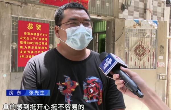 近日,广东中山一名房东祝贺租客之子高考考了608分的好成绩,特地为其免租四年,引发广泛关注。网友们纷纷点赞此事,称该名房东是“中国好房东”。记者联系上房东张先生,张先生表示,自己只是做了一件微不足道的小事,希望鼓励孩子能继续努力学习,回报父母的养育之恩。 据房东张先生介绍,自己是普通家庭,平时在珠海工作,为了孩子的学习搬到珠海居住。早年在中山坦洲镇建了楼房用以出租。 住户左先生租的是一个小单间,每月租金220元,已在此租住约10年,期间一直没涨过房租。虽然两人只是租赁关系,但左先生一家人的艰辛被房东张先生看在眼里。 张先生说,租客左先生夫妻俩分隔两地,省吃俭用,一直辛苦供孩子上学。“他的妻子在江门打工,陪小孩读书。他在中山经常上夜班,累得消瘦,平时也非常节俭,有时进屋也不开灯,一个月的水电费不超过20元。” 6月25日,广东高考陆续放榜。“608!”得知左先生的儿子高考考到608分的好成绩,张先生“打心底里替他们一家感到高兴”,并决定为左先生准备一份惊喜:免去左先生4年共一万多元的房租。 听到这个消息后,左先生十分诧异。但张先生表示,“他们夫妻俩都是打工人,在孩子读书方面也给不了过多的支持,孩子能考出这个成绩非常不容易。” 张先生坦言,走红之后很有压力,觉得自己只是做了一件微不足道的事,“免的租金也不多,我只是做了很小的事,不应该受到这么多关注。” 不过好在大多网友的留言让他觉得很感动,“不少网友说孩子要懂得感恩,努力学习回报社会。” 为张先生点赞 祝愿更多寒窗苦读的孩子 能学有所成