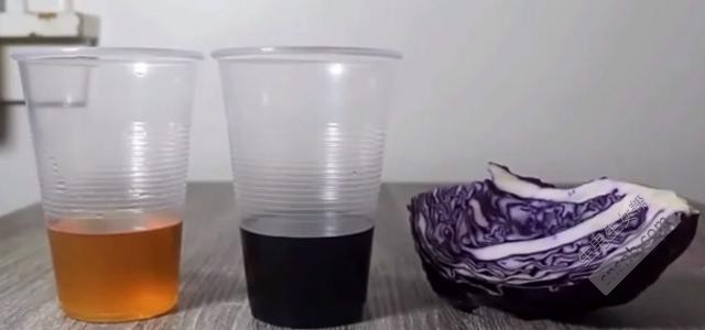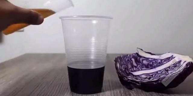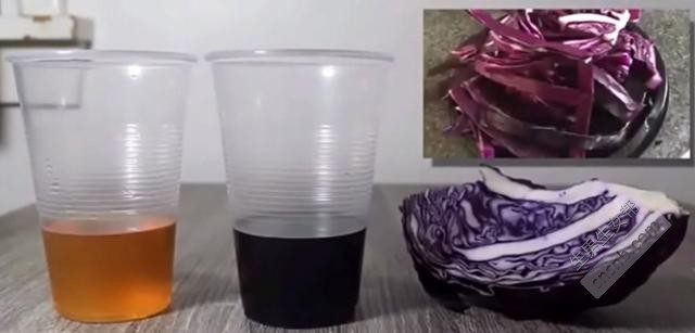 第二步、将紫甘蓝弄碎后用水煮开,大概蒸煮十分钟,然后将水过滤后倒入另一个透明塑料杯内。 第三步、将接取的孕妇尿液倒入装有甘蓝水的杯中。