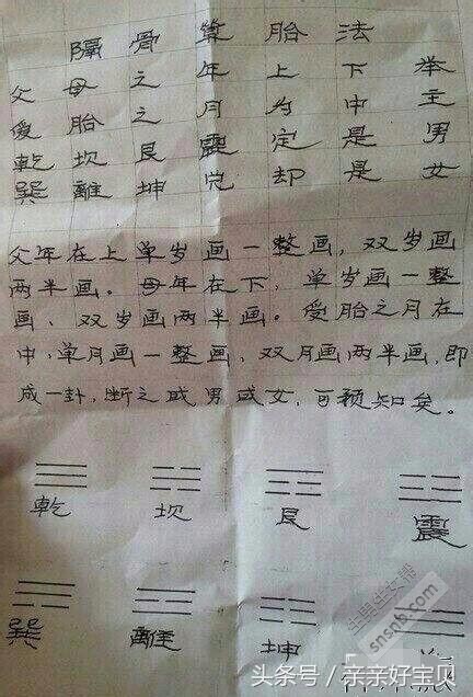 隔骨算胎法。这种算法呢,也比拟有来头,说是民间传播很久了,我的两个宝宝算的都准了。它也是有一张图,详细算法是男方在上单岁画一整画,双岁画两半画,女方在下,单岁也是画一整画,双岁画两半画,受胎之月在中间,单月画一整画,双月画两半画,最后就成一卦相,对照便知男女。乾坎艮震是男,巽離坤兑是女。