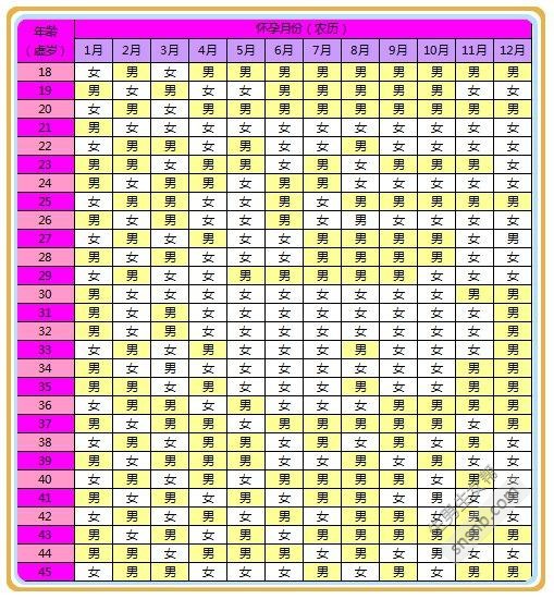传闻从清宫时期流传来下的预测生男生女表。它根源周易,依照阴阳、五行、八卦的公式推算而生,大致有三百多年的历史,由各朝大内宦官掌管,供王亲国戚使用,后来慢慢流落民间。 这个生男生女清宫表中1~12是代表怀孕月份,18~45代表女性的年龄,不过有一点要注意,这个生男生女清宫表是以虚龄计算的[1]。清宫表是一种数学上的推算预测,存在一个机率,准确率问题,简单的说,清宫表综合了,出生年月,温度,环境,个人生理健康等因此对生男生女的综合影响,总结出的一个概率表。 对于生男生女这个问题,其实生男生女不是由什么预测表来决定的,这是由基因的自由组合来实现的,对于这种组合多是由于自然选择的结果。 一般情况下是不准的,有的仅仅是巧合。因为人的性别是由生殖细胞中的XY染色体所决定的。因为精子中的一半其染色体为(22+X),另一半则是(22+Y)。所以男性的染色体中的X和Y是决定性别的染色体,当精子与卵细胞结合的时,性别就已经决定了。 清宫表以女性为准,年龄以受孕时的虚岁计,即当时的周岁再加一岁,列于表的竖列(从18到45岁),受孕月份以农历月份计算,排于表的横行(从1月到12月)。母亲虚龄与受孕月份的交叉处即显示为胎儿的性别,以达到预测胎儿性别的效果。 [操作方法] 年龄 和我们今天说的年龄不一样,清宫表中的年龄一定是指农历的算法,按照虚岁计算,虚岁是从怀胎开始算的,农历中一般的怀孕月只有9个月。清宫表预测生男生女中的年龄具体的计算方法是:当前年月-(减去)出生年月再+(加)9个月。(不需要出生的日) 比如:你是1985年8月出生,按2013年算,那你的周岁是28岁,虚岁则是28岁9个月=29岁算。 怀孕月份 这里涉及到一个温度影响生男生女的因素,如果按今天的科学来分析,在清宫表中并未具体分析,只是告诉你:受孕月份则以农历月份为准(按受孕当天,不是末次月经第一天,和今天医学上算怀孕时间是不一样的!) 注意:如果是遇到怀孕月份是在闰年的闰月,那么,闰月的上半个月算上个月,下半个月怀孕的算下个月。 [计算方法] 1.出生年月+9个月的农历虚龄为21岁,受孕月份在农历一月预测生男孩,受孕月份在农历二月则可以生女孩 2.出生年月+9个月的农历虚龄为24岁,受孕月份在农历三月预测生男孩,受孕月份在农历八月份预测生女孩 3.出生年月+9个月的农历虚龄为30岁,受孕月份在农历一月份预测生男孩,受孕月份在农历四月份预测生女孩 生男生女表预测表:女性年龄是以农历虚龄(即真实年龄加1岁)算,而怀孕月份即是受孕的那个月份,当然亦是以农历算 |