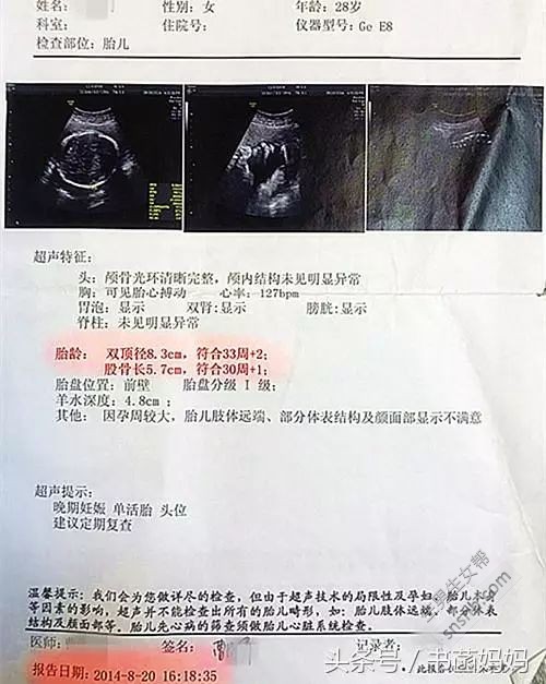 1 如何通过b超单双顶径和股骨长数据来判断宝宝性别呢? 双顶径-股骨长(以下简称“双-股”)大于2的就是男宝,准确率90%,否则就是女宝。小于2的,准确率90%为女孩儿。(等于2的,为男女比例各占一半)。 双顶径是指胎儿头部左右两侧之间最宽部位的长度,医生常用它来观察宝宝的发育情况,判断是否有头盆不称,顺利分娩。 股骨是人体最大的长骨,指大腿骨,股骨长就是指胎儿大腿骨长度, 股骨长也是来观察胎儿发育的情况常用指标。 2 先说明下,如果准爸妈都比较高和壮的情况下,那么无论宝宝是男是女,在孕后期大概30周之后双-股基本都会大于2.1,也有可能早期就大于2,这类父母用此方法判断就不是很准确。 如果准爸妈都是正常体格,不是特别高大的话,在准妈妈孕24周开始,双-股=1.7以上。此后每次B超双-股长就开始逐渐增加。如:24周相差1.7,28周相差2 ,30周后相差2.1 以上,那么是男宝的可能性就比较大。 菡妈大宝男孩30多周b超图 其次,宝宝双顶径产检时偏大,指的是比实际孕周偏大。如30周的双顶径,b超显示31~32周左右的数值。而不是指双-股大于2就叫大头。菡妈大宝的头从30周以后是突飞猛进的发育啊,一直是超出正常孕期2~3周左右。 因为有的宝宝,双顶径符合孕周,但股骨长却跟不上孕周,那么双-股必定大于2以上。这样的情况就不叫大头,只能说腿短。所以,有的宝妈看自己b超单会说不准也可能是这个原因。 小女宝33周左右b超图 其实,双顶径和股骨长都是医生用来观察胎儿发育的情况的,与胎儿的性别并没有直接关系。所以说,单纯只用这种方式来判断并不可能百分百准确。只是很多很多的孕妈妈在生完宝宝后分享时,发现了这个很有趣的数据现象。 小编身边很多的朋友用这个办法测试,准确率能在百分之八十以上。以上两张图就是小编今晚翻箱倒柜找出来兄妹俩30多周时候的b超单,两个宝宝是完全符合“大头儿子长腿妹”。欢迎宝妈朋友们对比了自己的b超数据给小编留言哦,等生完宝宝来给小编和其他准妈妈分享下吧o(∩_∩)o |
